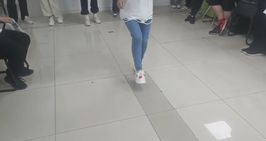 比赛的第一项是《运瓶盖》,这个游戏对身体平衡性可以是一种考验,瓶盖按要求放到脚背上(需穿鞋),单脚跳前进,不得借助任何外力的情况下把瓶盖放到指定容器视为成功,每个人采用依次接力的形式完成挑战,用时最少团队便可获胜。